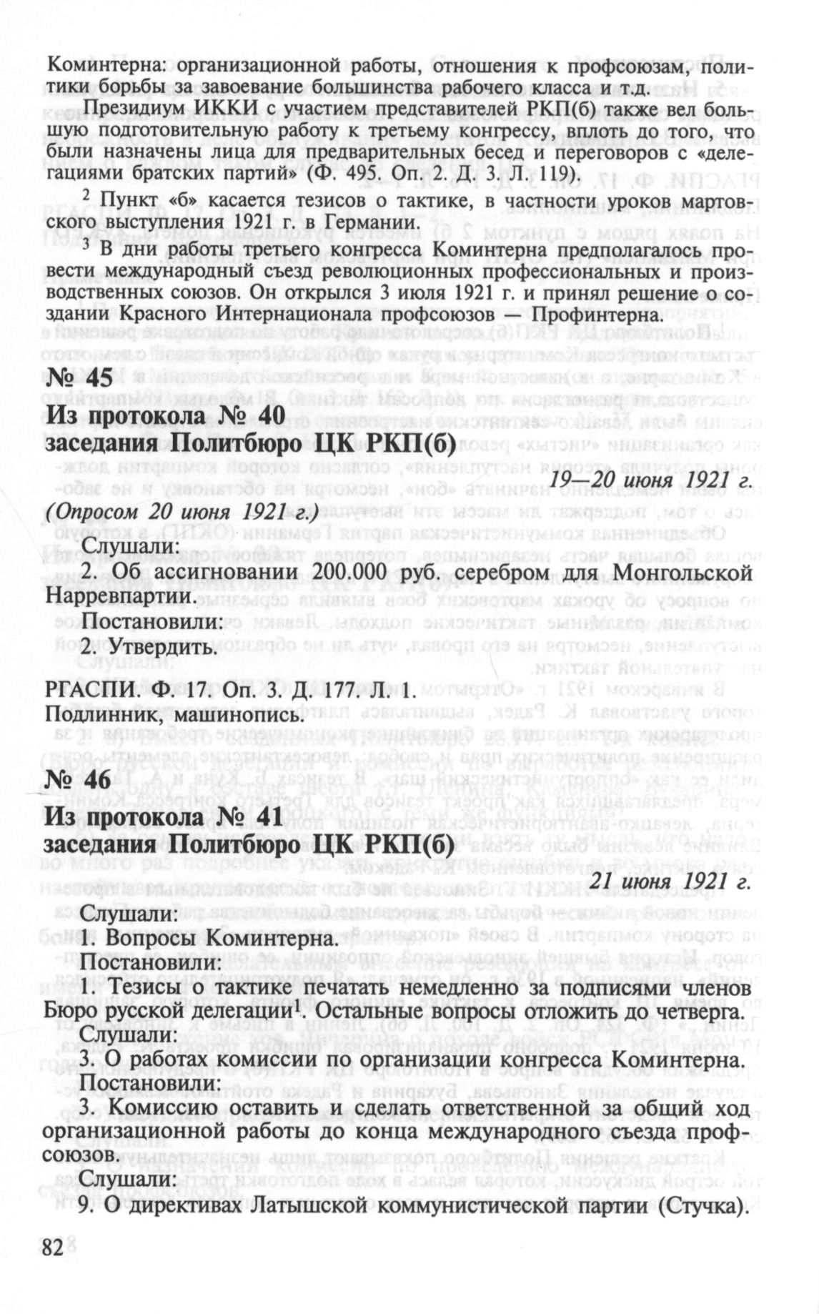 Из протокола № 40 заседания Политбюро ЦК РКП(б). Об ассигновании для МНРП. 19—20 июня 1921 г. // РГАСПИ. Ф. 17. Оп. 3. Д. 177. Л. 1. Подлинник, машинопись.