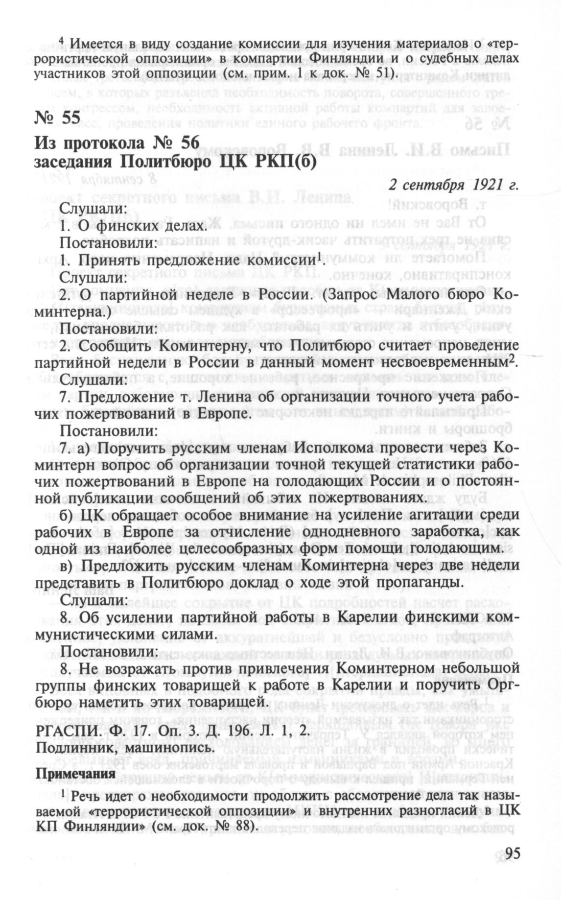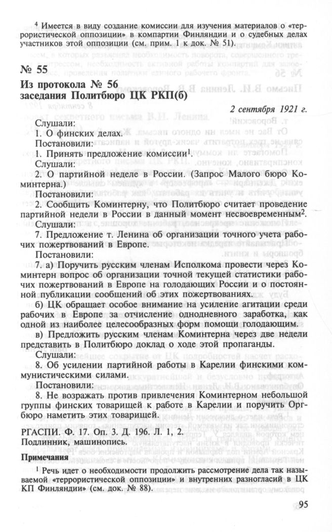 Из протокола № 56 заседания Политбюро ЦК РКП(б). О финских делах. О рабочих пожертвованиях. 2 сентября 1921 г. // РГАСПИ. Ф. 17. Оп. 3. Д. 196. Л. 1, 2. Подлинник, машинопись.