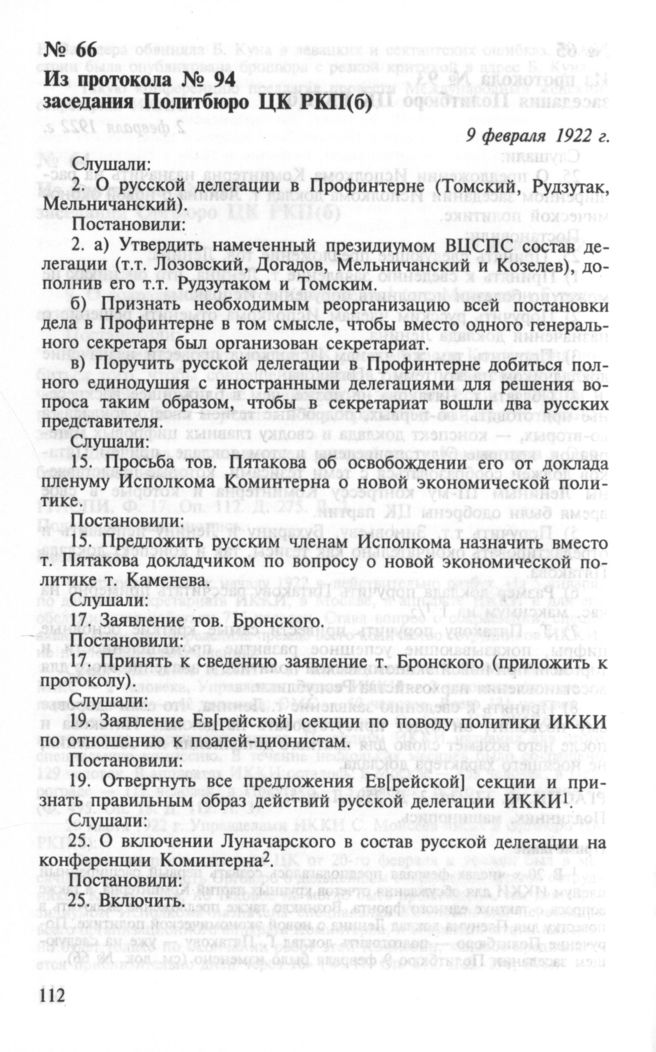 Из протокола № 94 заседания Политбюро ЦК РКП(б). О русской делегации в Профинтерне. Об отношении ИККИ к Поалей Цион. 9 февраля 1922 г. // РГАСПИ. Ф. 17. Оп. 3. Д. 261. Л. 1, 3, 4, 5, 11-12. Подлинник, машинопись.