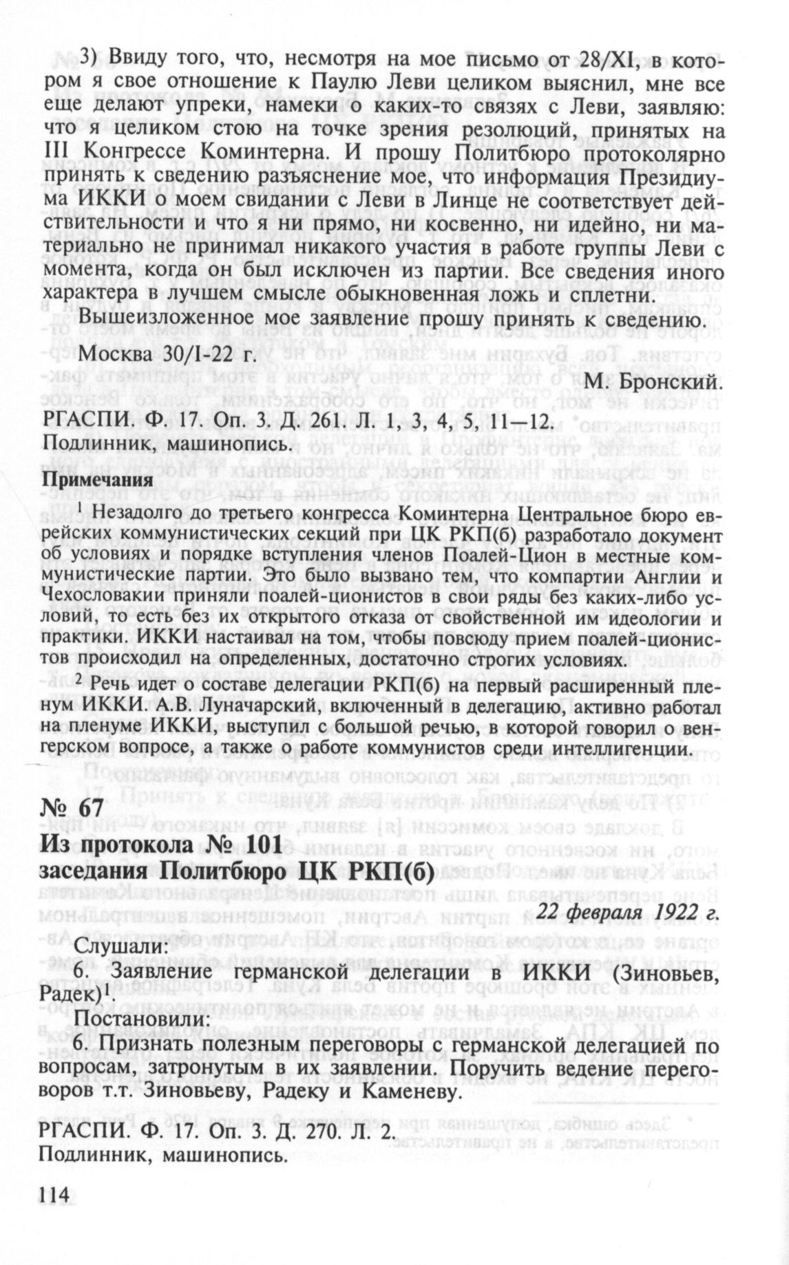 Из протокола № 101 заседания Политбюро ЦК РКП(б). Заявление делегации КПГ в ИККИ. 22 февраля 1922 г. // РГАСПИ. Ф. 17. Оп. 3. Д. 270. Л. 2. Подлинник, машинопись.