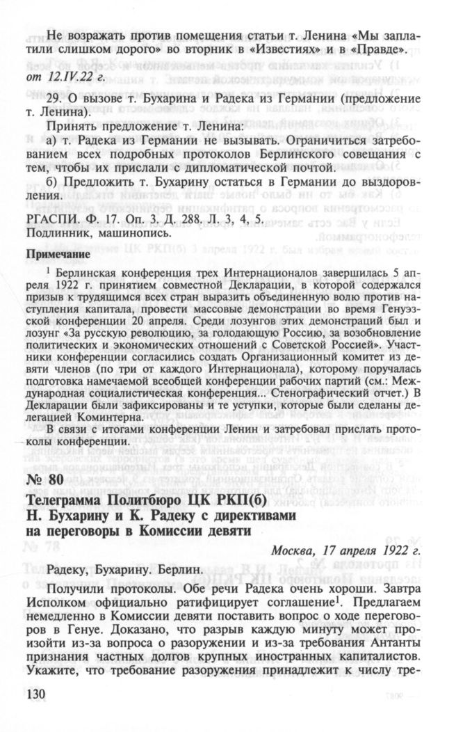 Телеграмма Политбюро ЦК РКП(б) Н. Бухарину и К. Радеку с директивами на переговоры в Комиссии девяти. 17 апреля 1922 г. // РГАСПИ. Ф. 495. Оп. 18. Д. 122. Л. 22. Подлинник, машинопись с рукописной правкой.; Коминтерн и идея мировой революции: Документы. М., 1998. С. 390—391.