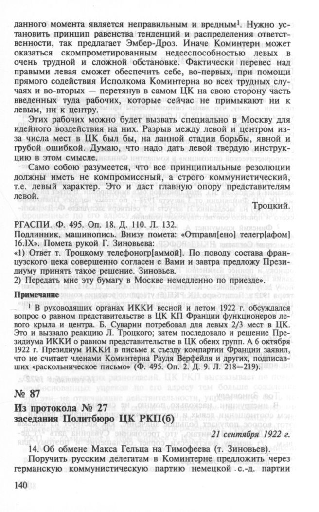 Из протокола № 27 заседания Политбюро ЦК РКП(б). О М. Гельце. 21 сентября 1922 г. // РГАСПИ. Ф. 17. Оп. 3. Д. 313. Л. 4. Подлинник, машинопись.