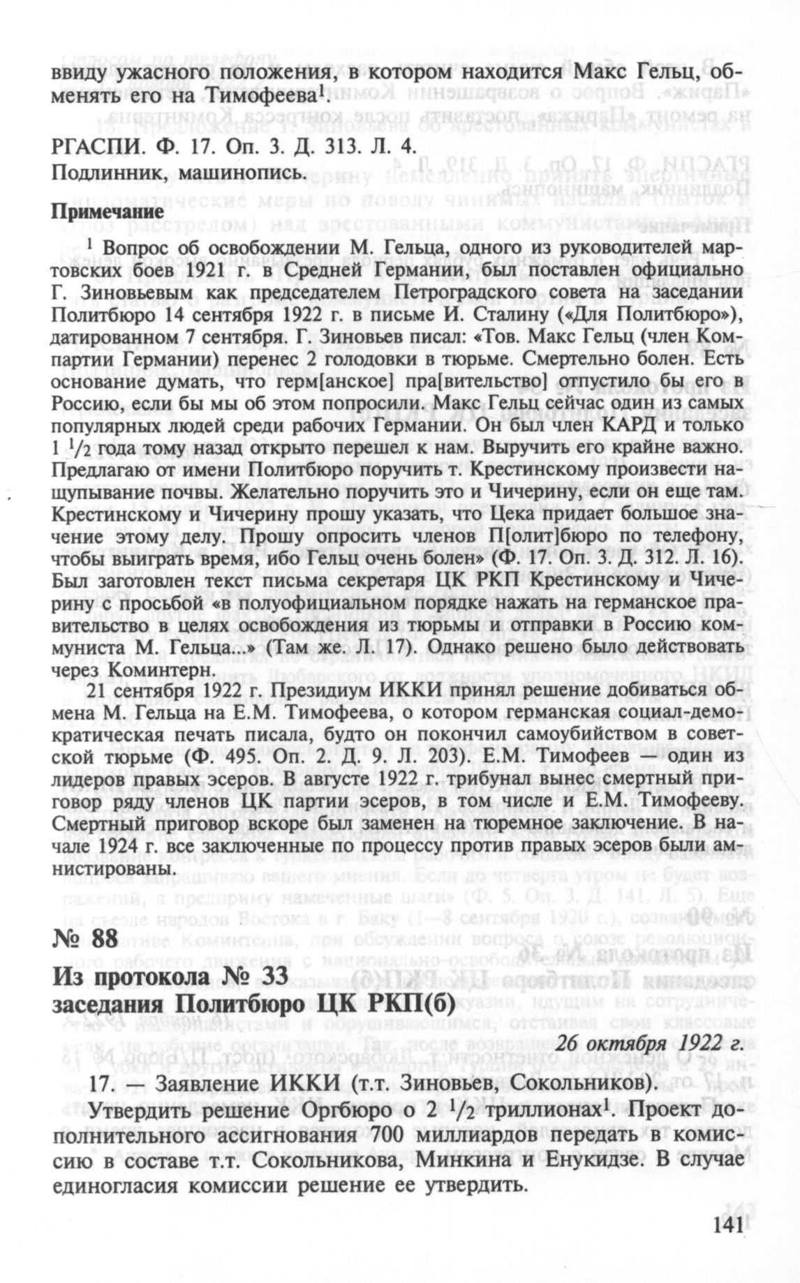 Из протокола № 33 заседания Политбюро ЦК РКП(б). Об ассигнованиях для Коминтерна. 26 октября 1922 г. // РГАСПИ. Ф. 17. Оп. 3. Д. 319. Л. 4. Подлинник, машинопись.