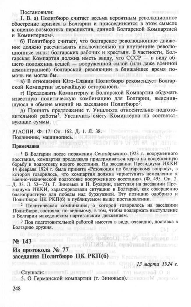 Из протокола № 77 заседания Политбюро ЦК РКП(б). О германской компартии. 13 марта 1924 г. // РГАСПИ. Ф. 17. Оп. 3. Д. 425. Л. 5. Подлинник, машинопись.