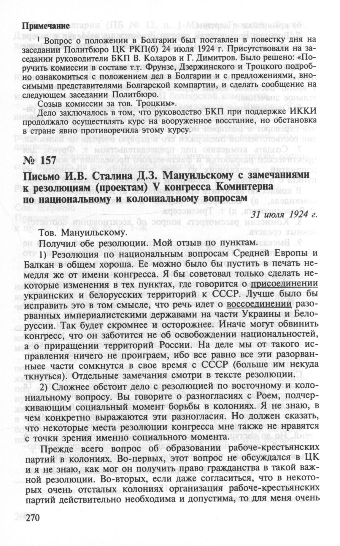 Письмо И.В. Сталина Д.З. Мануильскому с замечаниями к резолюциям (проектам) V конгресса Коминтерна по национальному и колониальным вопросам. 31 июля 1924 г.