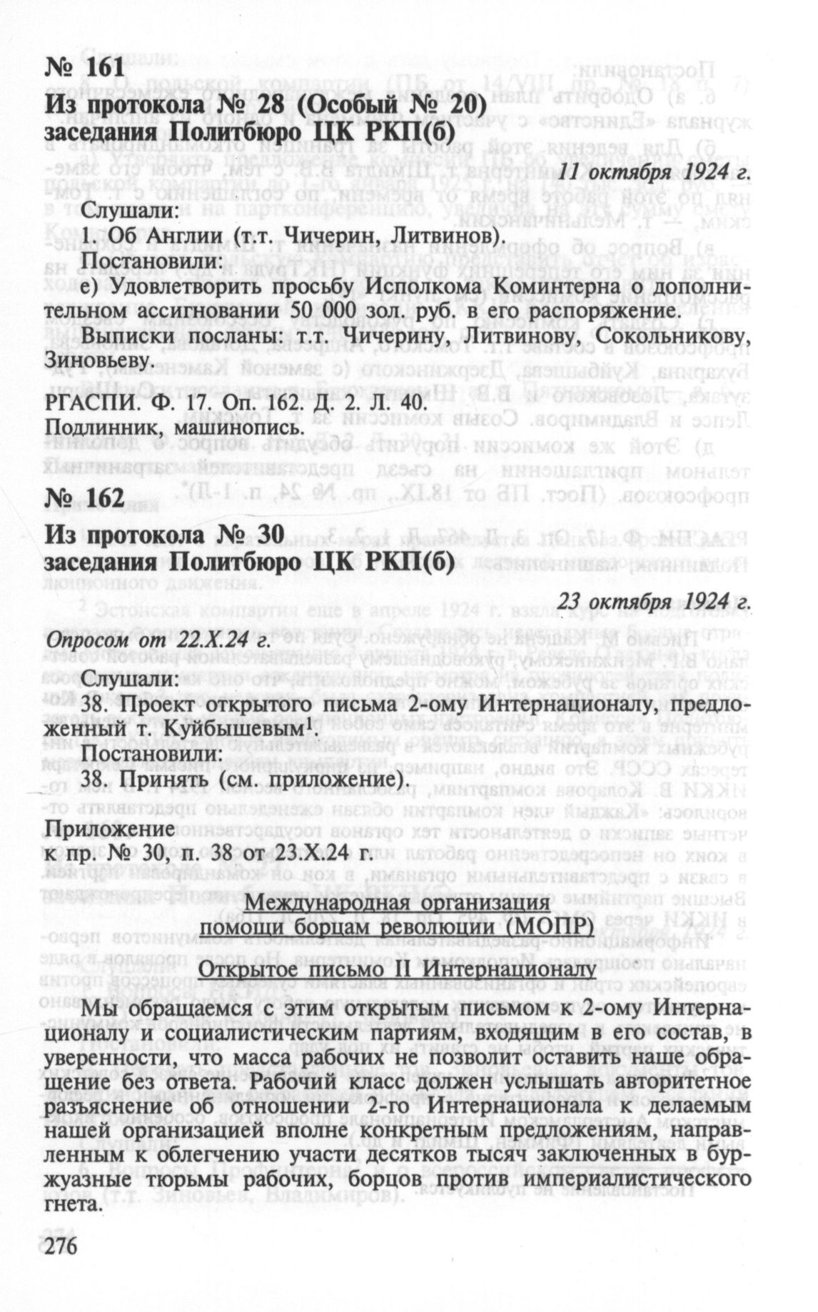 Из протокола № 28 (Особый № 20) заседания Политбюро ЦК РКП(б). Об ассигновании средств для коминтерновской работы в Англии. 11 октября 1924 г. // РГАСПИ. Ф. 17. Оп. 162. Д. 2. Л. 40. Подлинник, машинопись.