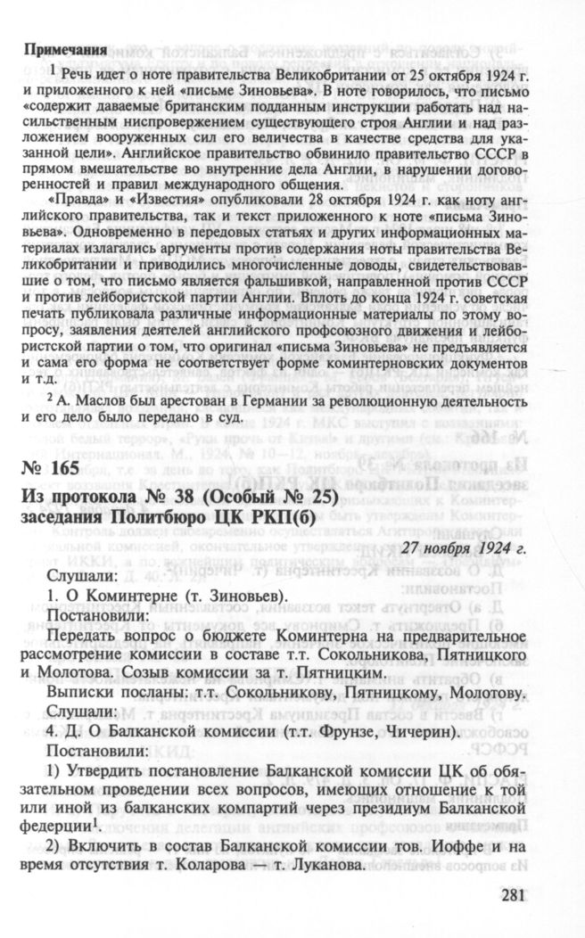 Из протокола № 38 (Особый № 25) заседания Политбюро ЦК РКП(б). О бюджете Коминтерна. О балканской комиссии. 27 ноября 1924 г. // РГАСПИ. Ф. 17. Оп. 162. Д. 2. Л. 45. Подлинник, машинопись.
