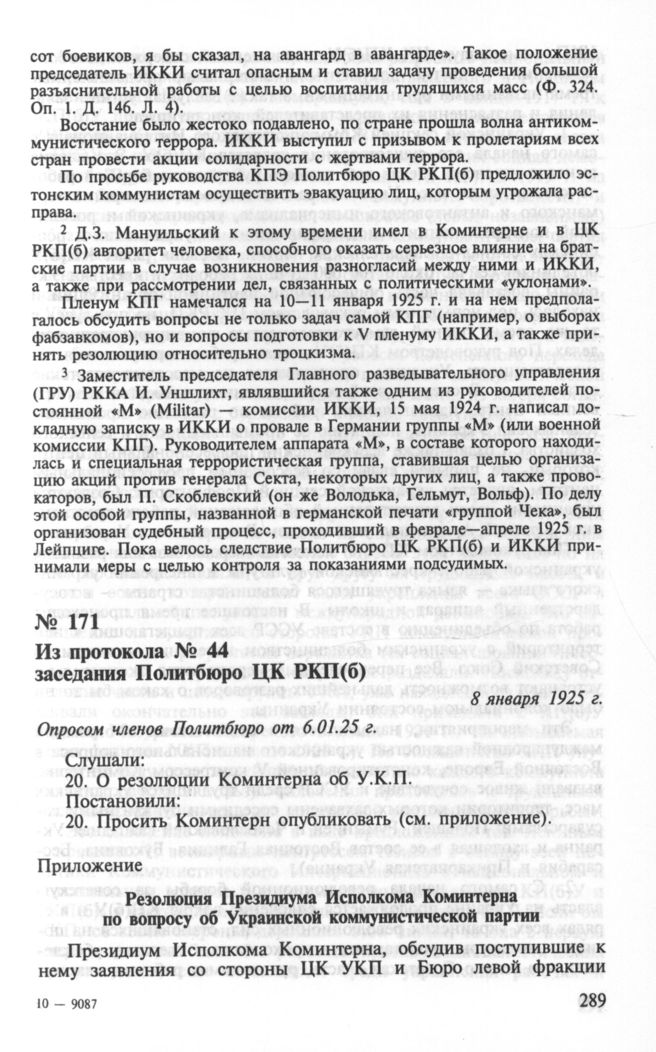 Из протокола № 44 заседания Политбюро ЦК РКП(б). О резолюции ИККИ об Украинской коммунистической партии. 8 января 1925 г. // РГАСПИ. Ф. 17. Оп. 3. Д. 484. Л. 4.; РГАСПИ. Ф. 17. Оп. 84. Д. 779. Л. 77-81. Подлинник, машинопись.