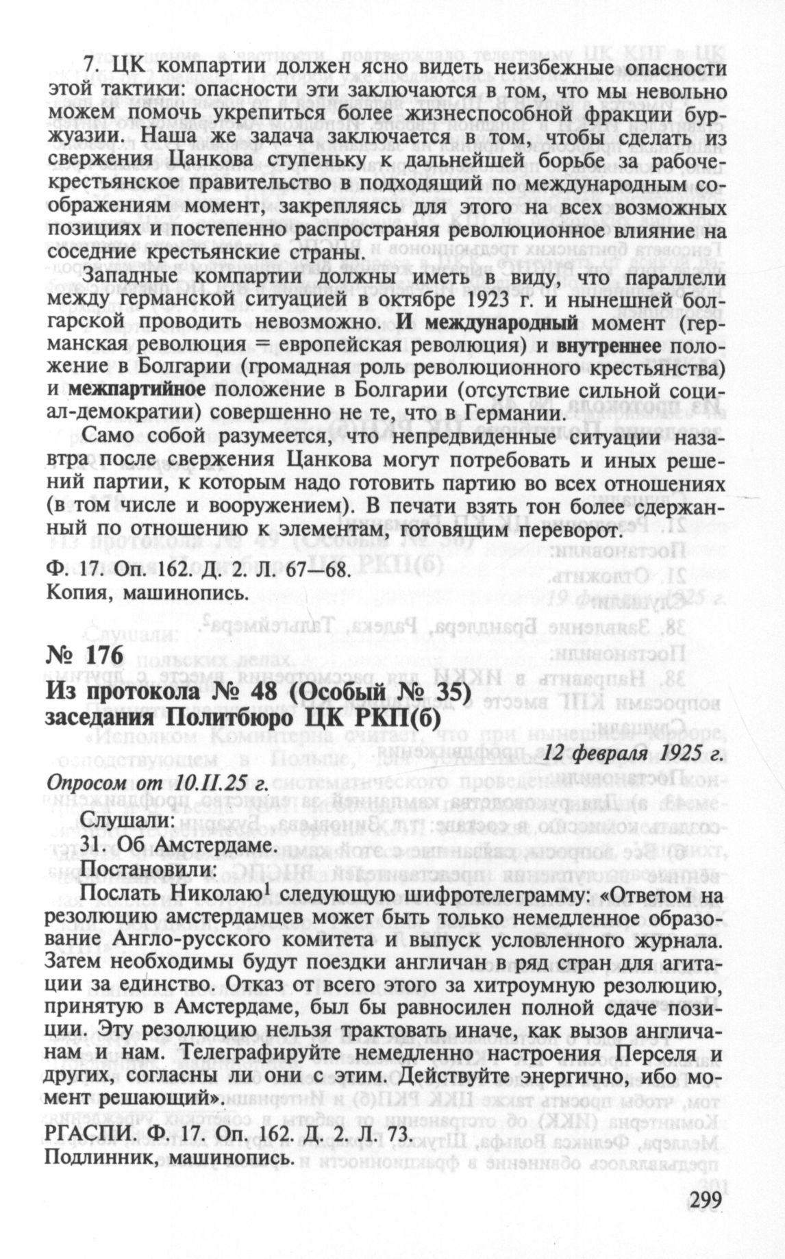 Из протокола № 48 (Особый № 35) заседания Политбюро ЦК РКП(б). Об образовании Англо-Русского комитета. 12 февраля 1925 г . // РГАСПИ. Ф. 17. Оп. 162. Д. 2. Л. 73. Подлинник, машинопись.