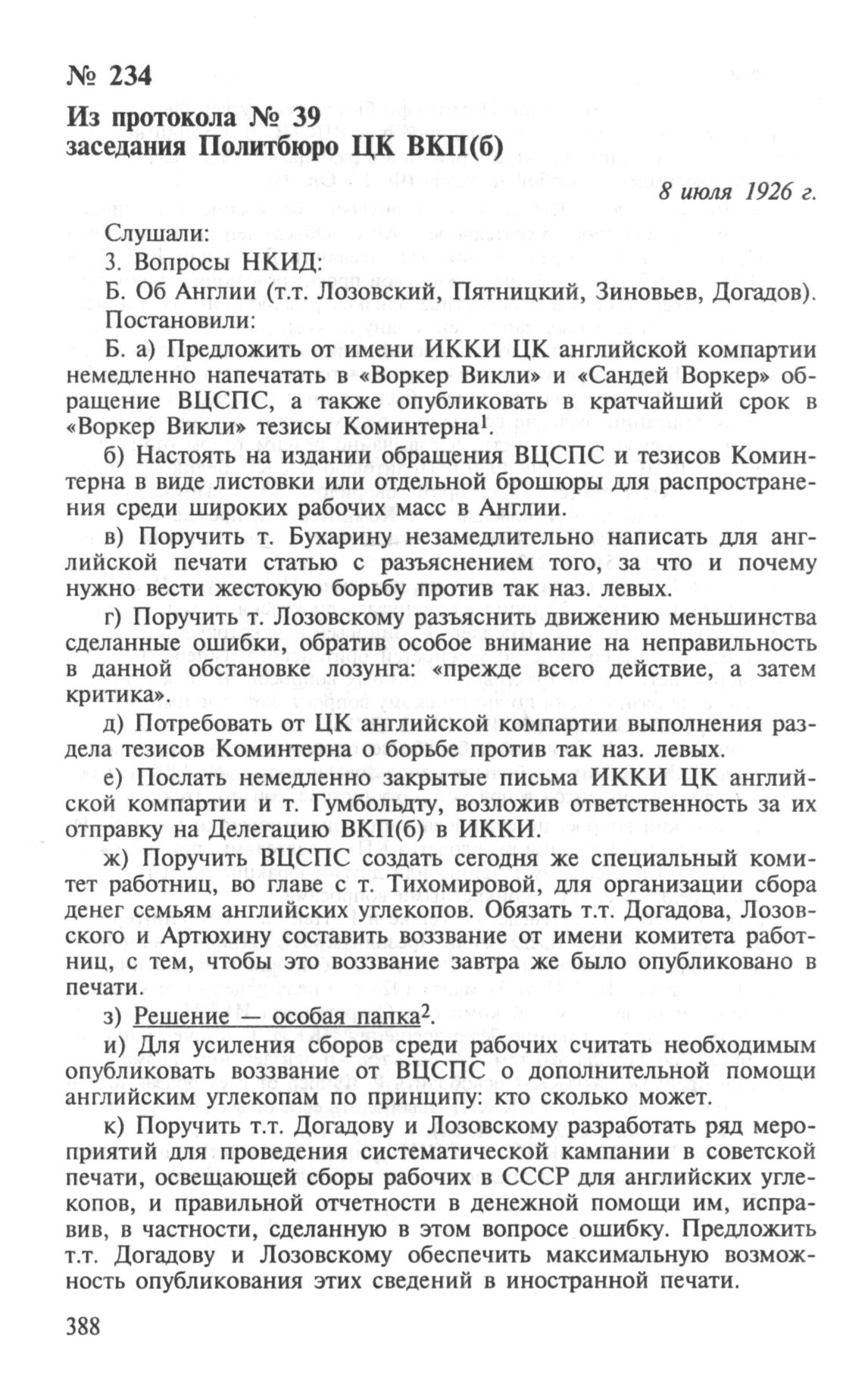 Из протокола № 39 заседания Политбюро ЦК ВКП(б). Об Англии. 8 июля 1926 г. // РГАСПИ. Ф. 17. Оп. 3. Д. 573. Л. 2, 3. Подлинник, машинопись.