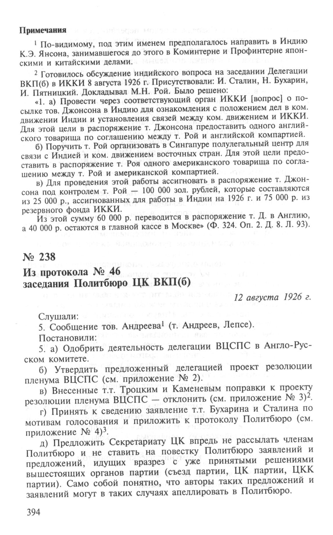 Из протокола № 46 заседания Политбюро ЦК ВКП(б). О деятельности ВЦСПС в Англо-Русском комитете. О журнале «Коммунистический Интернационал». 12 августа 1926 г. // РГАСПИ. Ф. 17. Оп. 3. Д. 580. Л. 3, 6, 8, 17-20. Подлинник, машинопись.