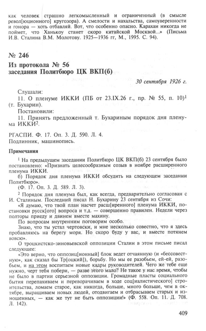 Из протокола № 56 заседания Политбюро ЦК ВКП(б). О пленуме ИККИ. 30 сентября 1926 г. // РГАСПИ. Ф. 17. Оп. 3. Д. 590. Л. 4. Подлинник, машинопись.