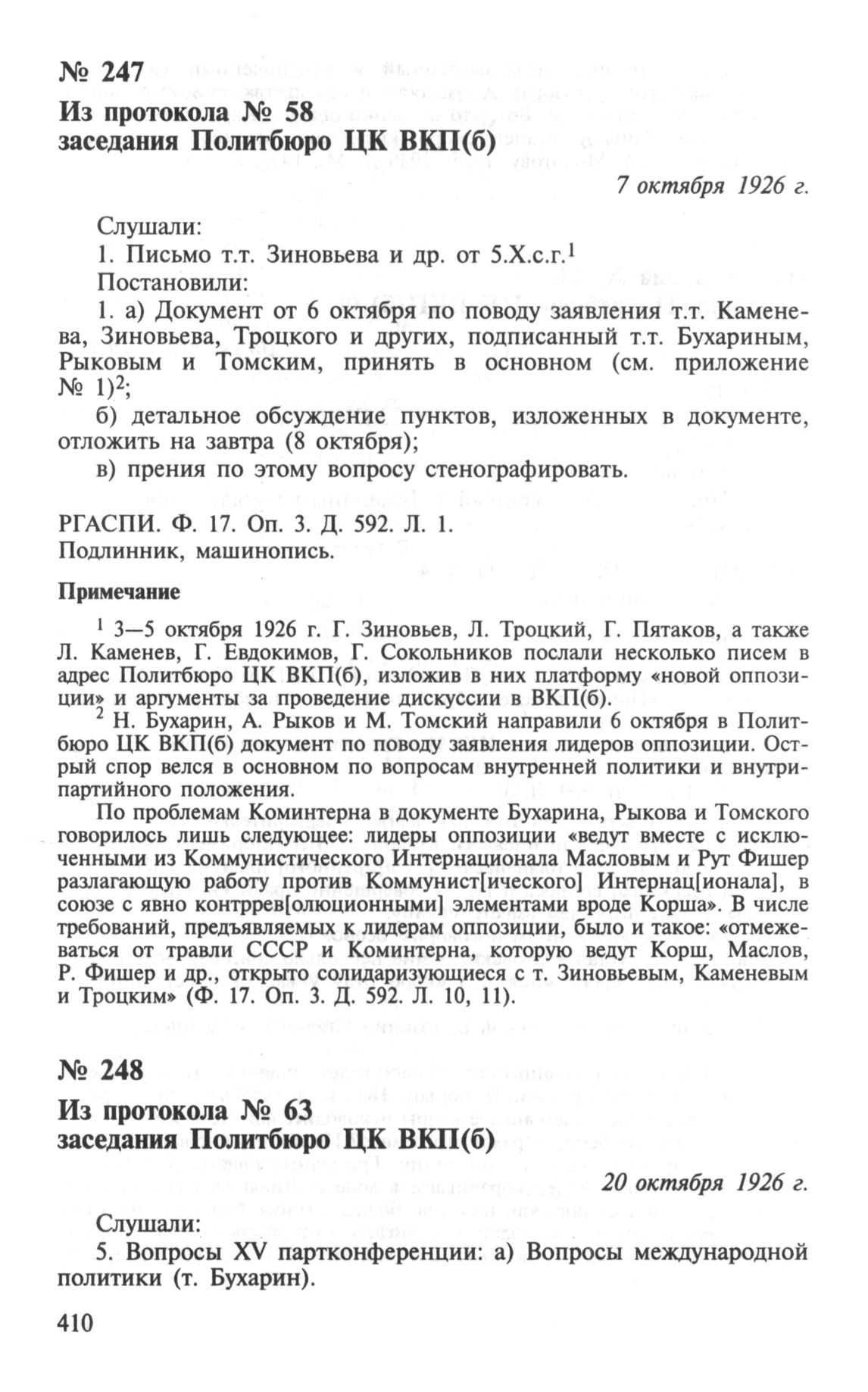 Из протокола № 63 заседания Политбюро ЦК ВКП(б). Коминтерновские вопросы на пленуме ЦК ВКП(б) и XV партийной конференции. 20 октября 1926 г. // РГАСПИ. Ф. 17. Оп. 3. Д. 597. Л. 3. Подлинник, машинопись.