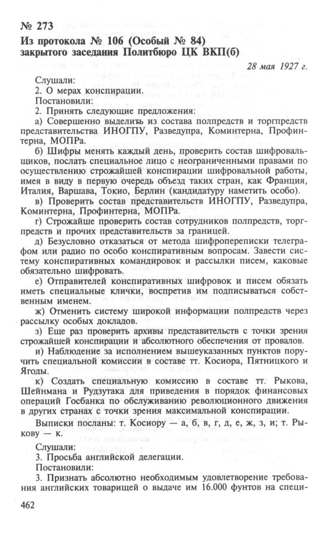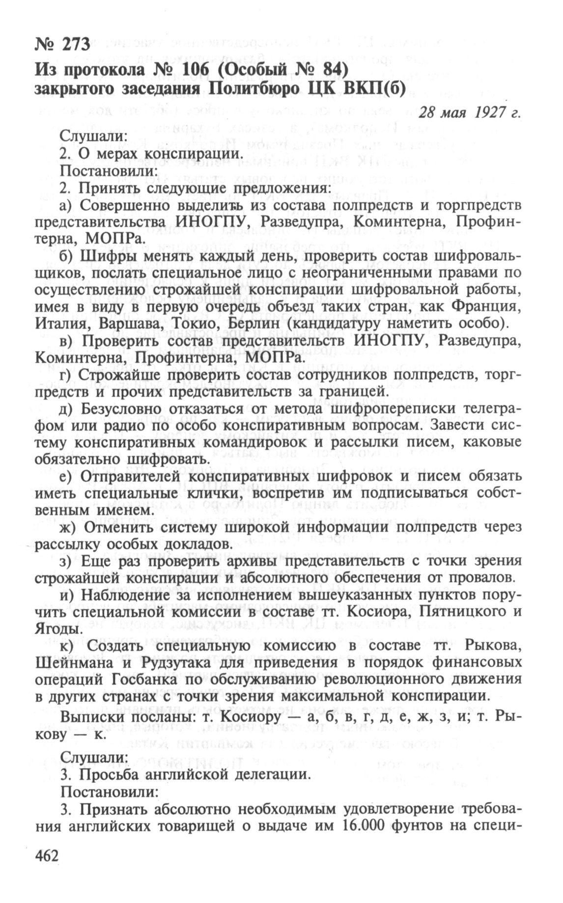 Из протокола № 106 (Особый № 84) закрытого заседания Политбюро ЦК ВКП(б). О мерах конспирации. 28 мая 1927 г. // РГАСПИ. Ф. 17. Оп. 162. Д. 5. Л. 24-25. Подлинник, машинопись.