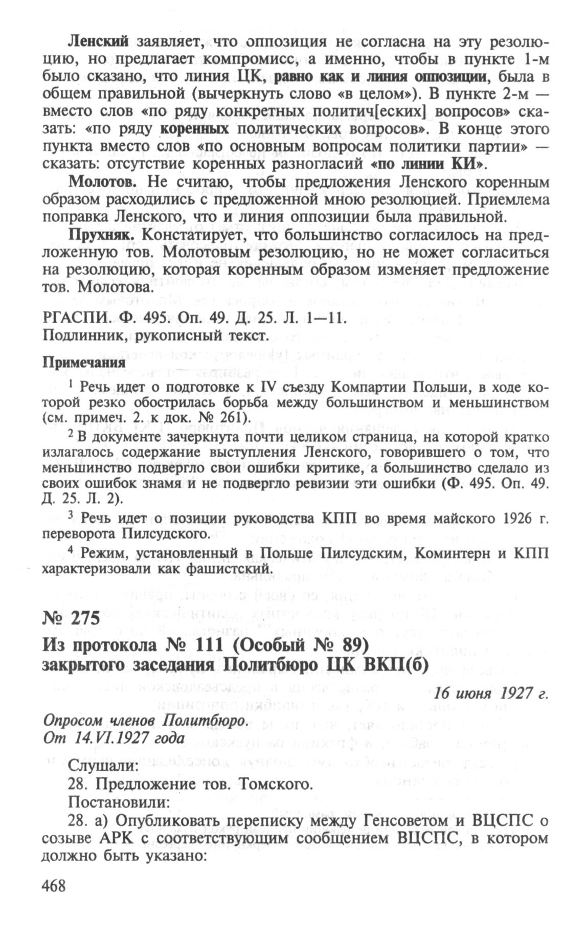 Из протокола № 111 (Особый № 89) закрытого заседания Политбюро ЦК ВКП(б). Об Англо-Русском комитете. О Китае. 16 июня 1927 г. // РГАСПИ. Ф. 17. Оп. 162. Д. 5. Л. 41, 42. Подлинник, машинопись.