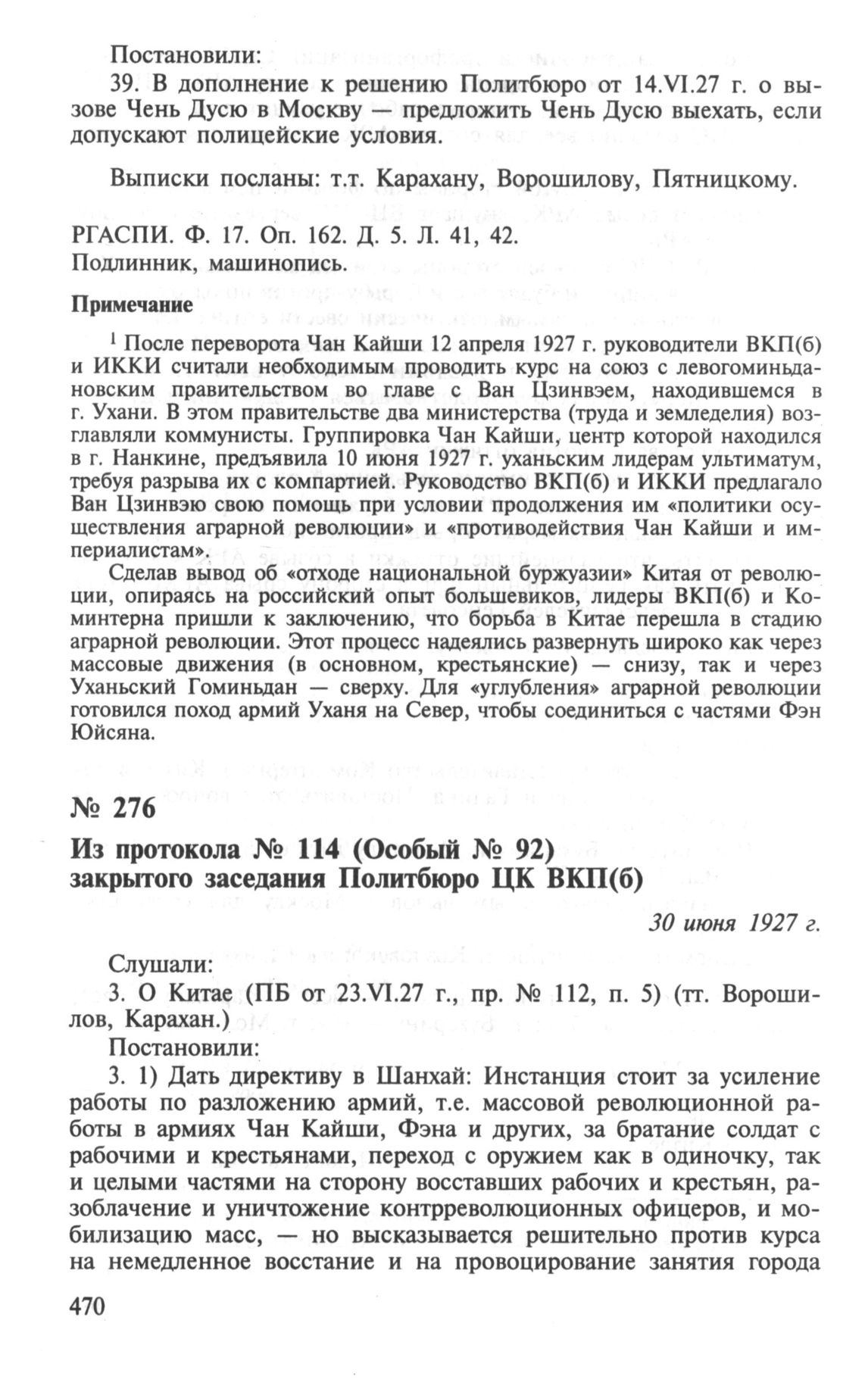 Из протокола № 114 (Особый № 92) закрытого заседания Политбюро ЦК ВКП(б). О Китае. 30 июня 1927 г. // РГАСПИ. Ф. 17. Оп. 162. Д. 5. Л. 55-58. Подлинник, машинопись.; ВКП(б), Коминтерн и национально-революционное движение в Китае. Т. II. 1926-1927 г. Ч. 2. М., 1996. С. 825-827.