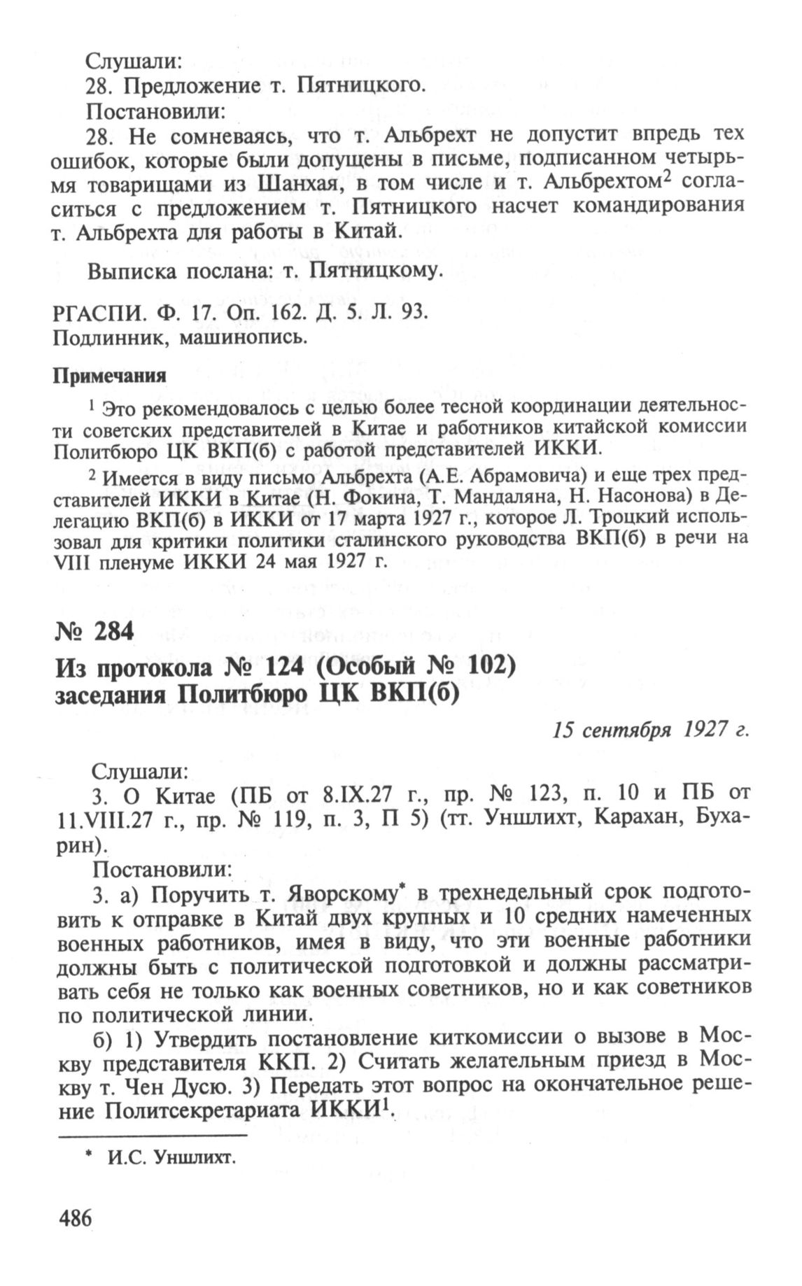 Из протокола № 124 (Особый № 102) заседания Политбюро ЦК ВКП(б). О Китае. 15 сентября 1927 г. // РГАСПИ. Ф. 17. Оп. 162. Д. 5. Л. 98-99. Подлинник, машинопись.
