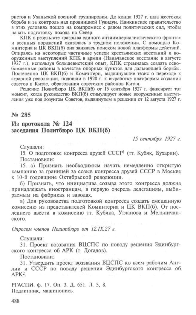 Из протокола № 124 заседания Политбюро ЦК ВКП(б). О конгрессе друзей СССР. 15 сентября 1927 г. // РГАСПИ. Ф. 17. Оп. 3. Д. 651. Л. 5, 8. Подлинник, машинопись.