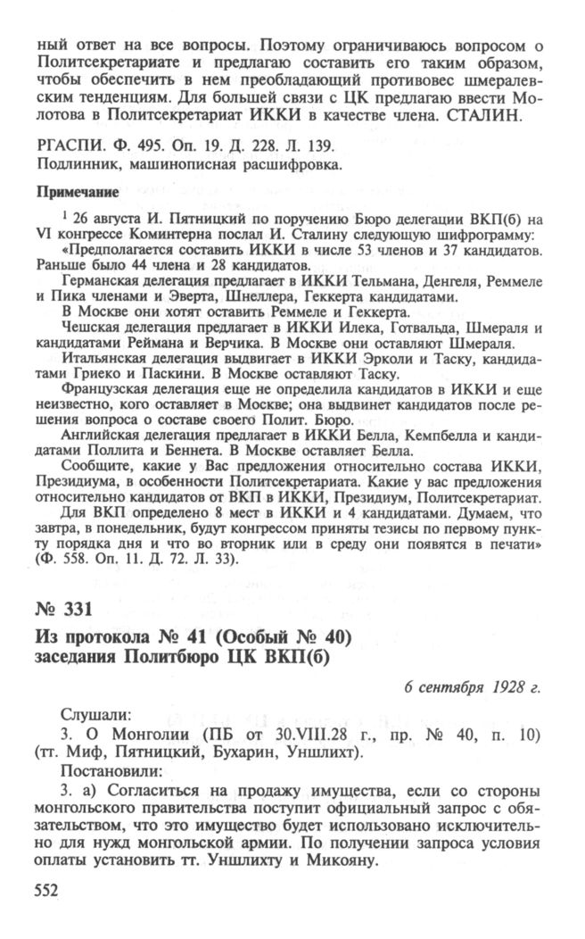 Из протокола № 41 (Особый № 40) заседания Политбюро ЦК ВКП(б). О Монголии. О положении в КП Польши. 6 сентября 1928 г. // РГАСПИ. Ф. 17. Оп. 162. Д. 6. Л. 125, 126. Подлинник, машинопись.