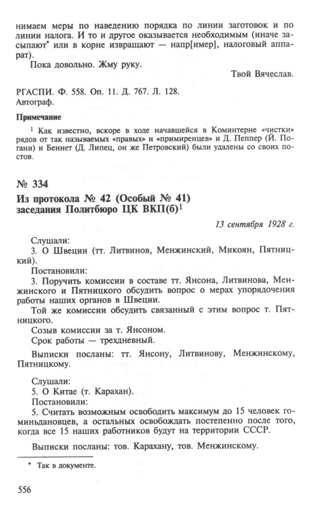 Из протокола № 42 (Особый № 41) заседания Политбюро ЦК ВКП(б). О Швеции, о Китае, о Монголии. 13 сентября 1928 г. // РГАСПИ. Ф. 17. Оп. 162. Д. 6. Л. 128-132. Подлинник, машинопись.