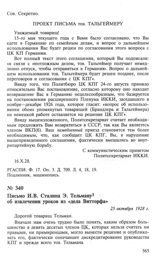 Письмо И.В. Сталина Э. Тельману об извлечении уроков из «дела Витторфа». 25 октября 1928 г. // РГАСПИ. Ф. 558. Оп. 11. Д. 817. Л. 92. Копия, машинопись.