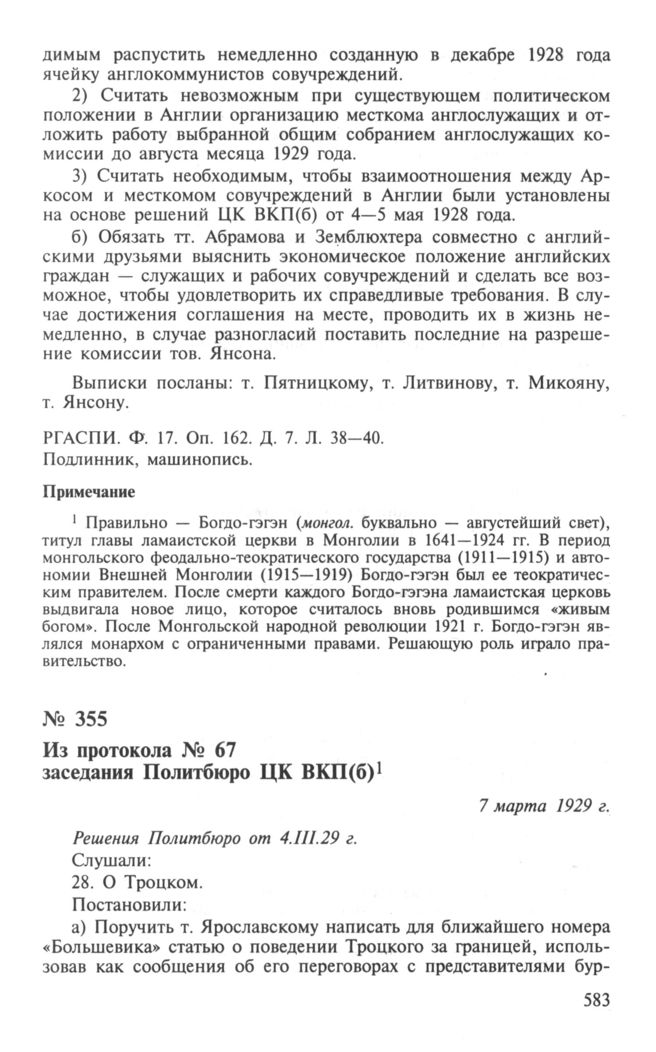 Из протокола № 67 заседания Политбюро ЦК ВКП(б). О Троцком. О Вандервельде. 7 марта 1929 г. // РГАСПИ. Ф. 17. Оп. 3. Д. 729. Л. 5, 6, 7. Подлинник, машинопись.
