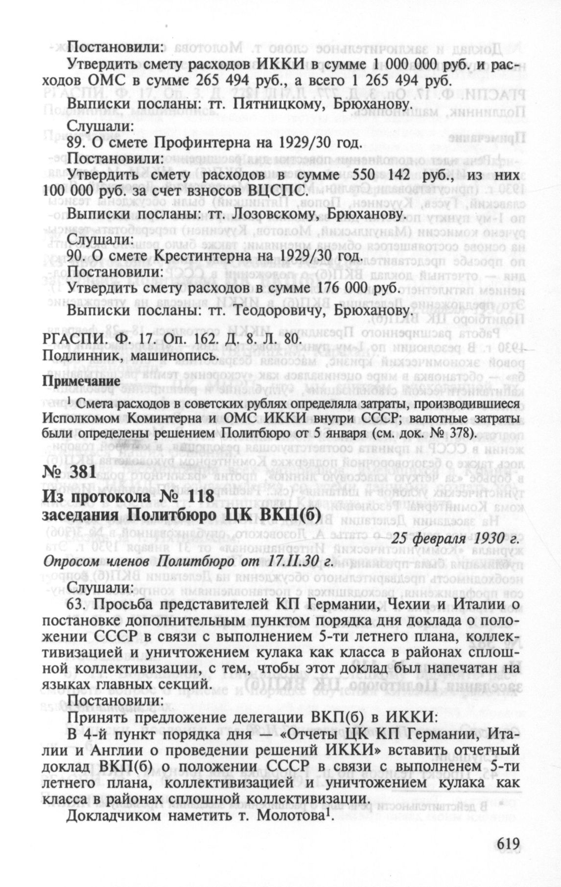 Из протокола № 118 заседания Политбюро ЦК ВКП(б). О повестке дня расширенного заседания Президиума ИККИ. 25 февраля 1930 г. // РГАСПИ. Ф. 17. Оп. 3. Д. 777. Л. 11, 12. Подлинник, машинопись.