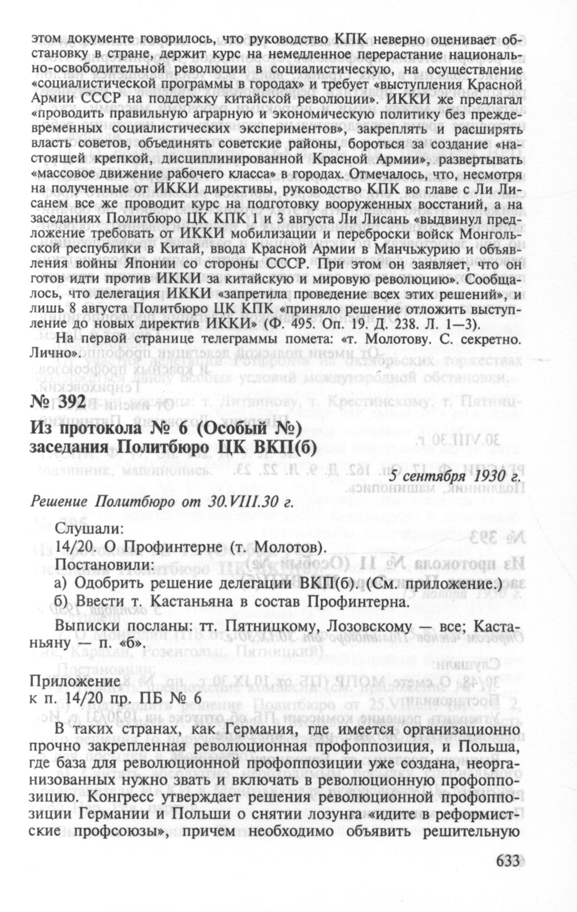 Из протокола № 6 (Особый №) заседания Политбюро ЦК ВКП(б). О Профинтерне. 5 сентября 1930 г. // РГАСПИ. Ф. 17. Оп. 162. Д. 9. Л. 22, 23. Подлинник, машинопись.