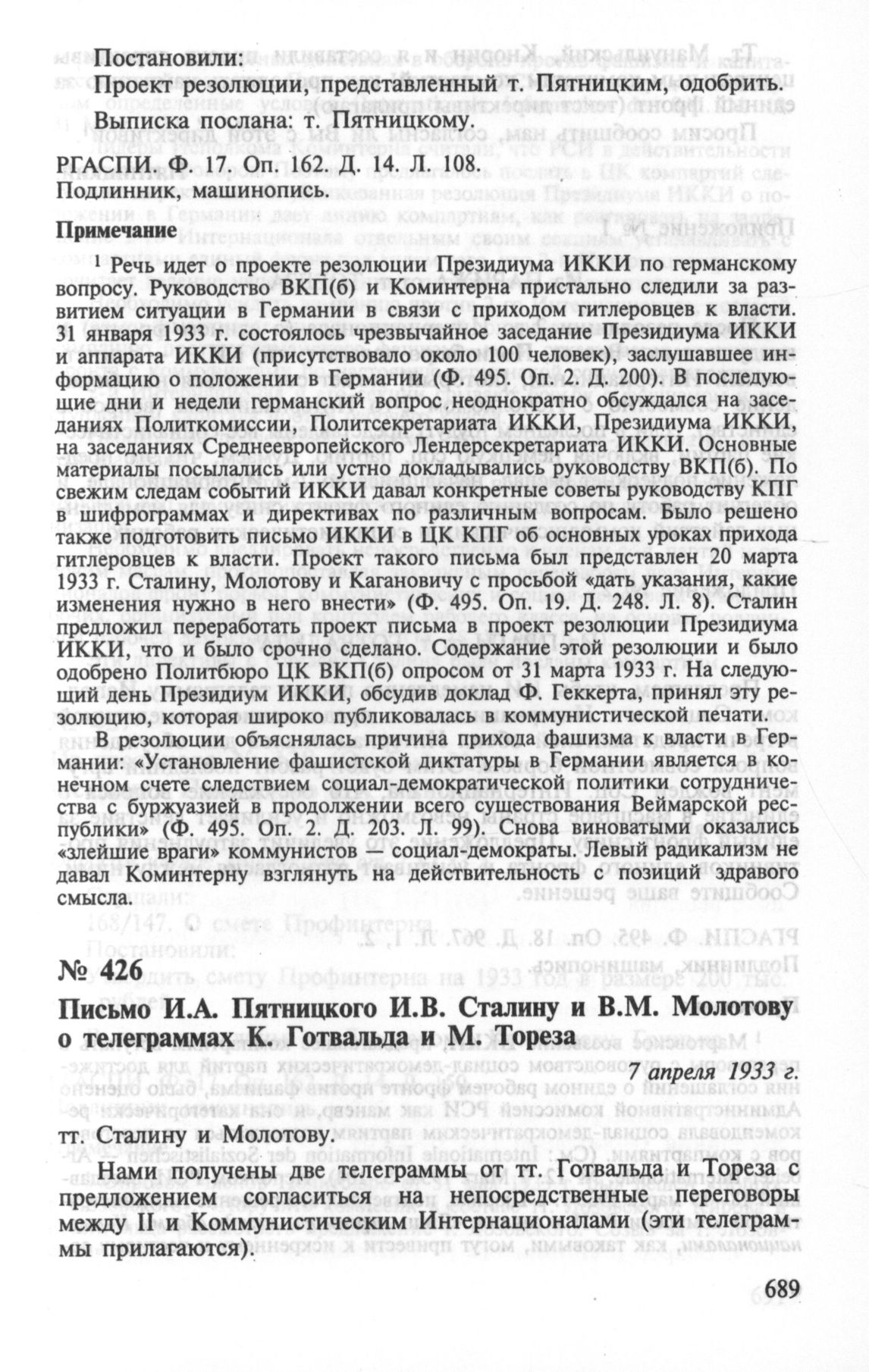 Письмо И.А. Пятницкого И.В. Сталину и В.М. Молотову о телеграммах К. Готвальда и М. Тореза. 7 апреля 1933 г. // РГАСПИ. Ф. 495. Оп. 18. Д. 967. Л. 1, 2. Подлинник, машинопись.