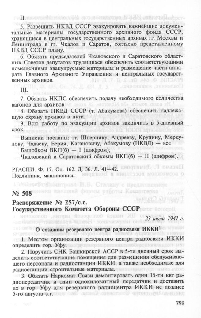 Распоряжение № 257/с.с. Государственного Комитета Обороны СССР о создании резервного центра радиосвязи ИККИ. 23 июля 1941 г. // РГАСПИ. Ф. 644. Оп. 2. Д. 7. Л. 116. Подлинник, машинопись.