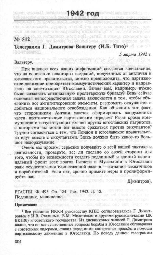 Телеграмма Г. Димитрова Вальтеру (И.Б. Тито) 5 марта 1942 г. // РГАСПИ. Ф. 495. Оп. 184. Исх. 1942. Д. 18. Подлинник, машинопись.