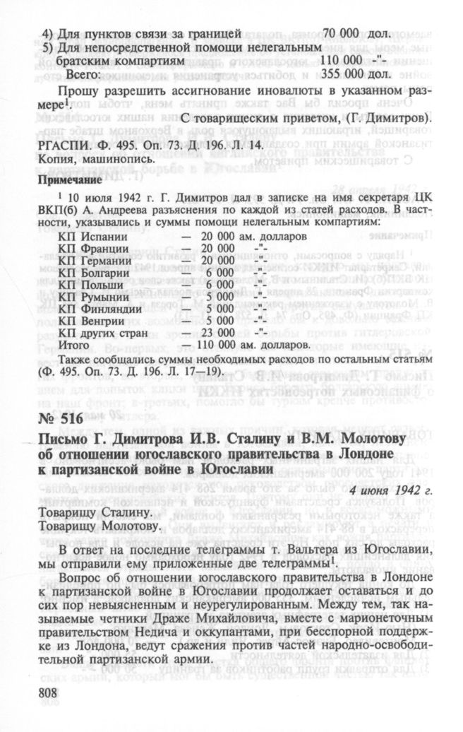 Письмо Г. Димитрова И.В. Сталину и В.М. Молотову об отношении югославского правительства в Лондоне к партизанской войне в Югославии. 4 июня 1942 г. // РГАСПИ. Ф. 495. Оп. 74. Д. 595. Л. 22. Подлинник, машинопись.