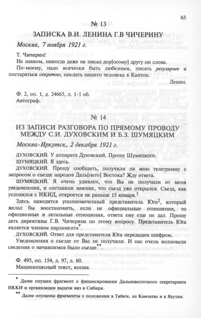 Из записи разговора по прямому проводу между С.И. Духовским и Б.З. Шумяцким. Москва - Иркутск, 2 декабря 1921 г. // РЦХИДНИ. Ф. 495, оп. 154, д. 97, л. 60. Машинописный текст, копия.