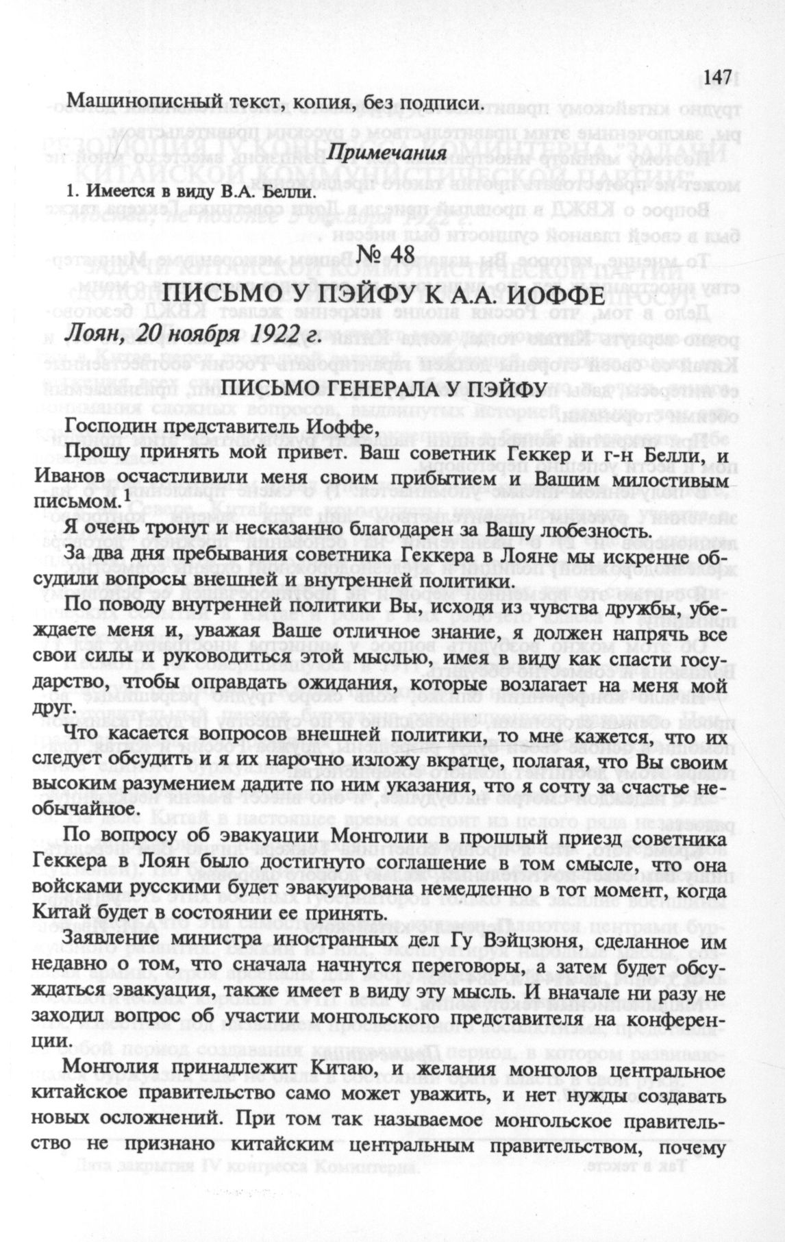 Письмо У Пэйфу к А.А. Иоффе. Лоян, 20 ноября 1922 г. // РЦХИДНИ. Ф. 5, oп. 1, д. 2144, л. 284-285. Машинописный текст, копия.