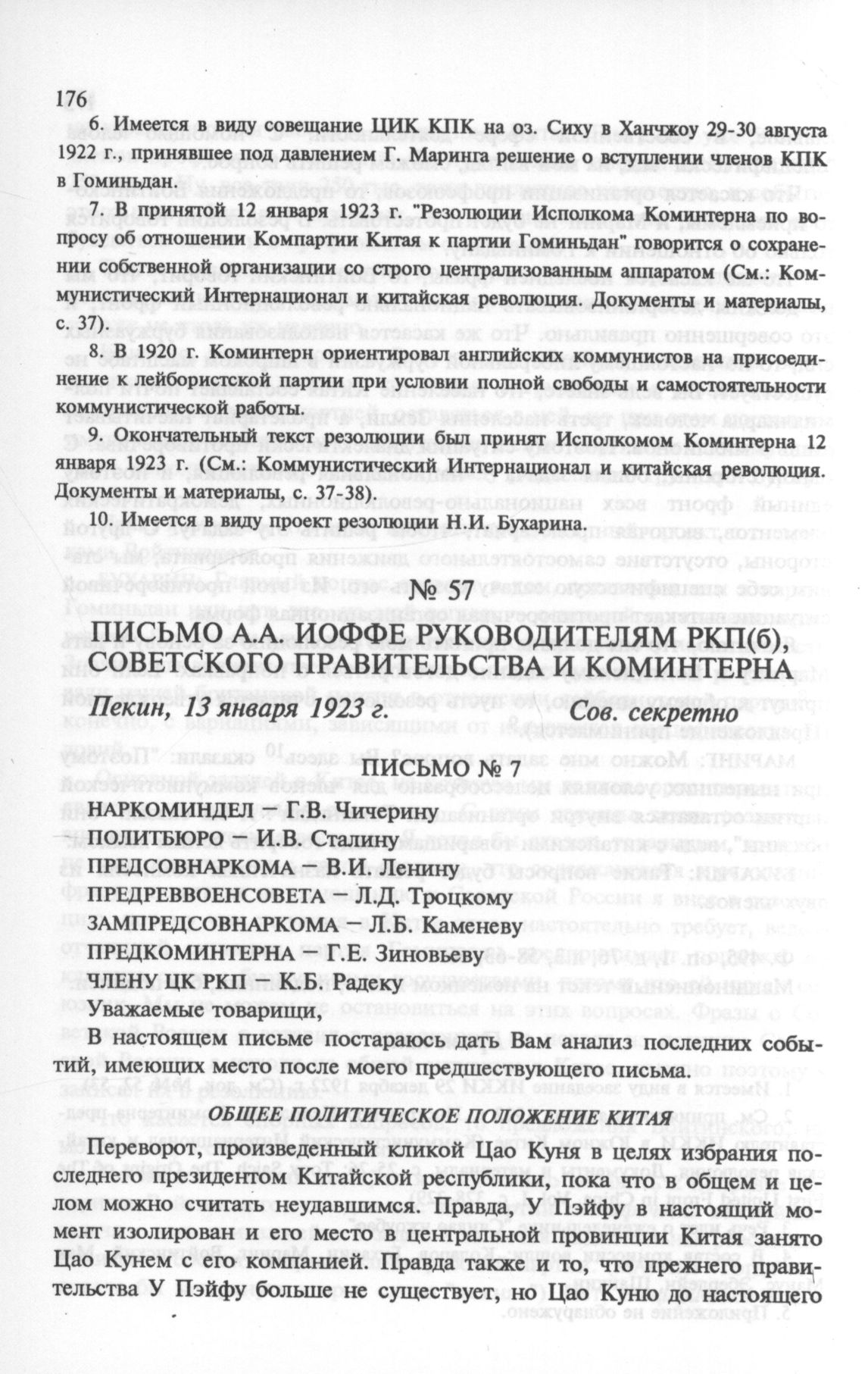Письмо А.А. Иоффе руководителям РКП(б), советского правительства и Коминтерна. Пекин, 13 января 1923 г. // РЦХИДНИ. Ф. 514, oп. 1, д. 46, л. 1-8. Машинописный текст, копия.