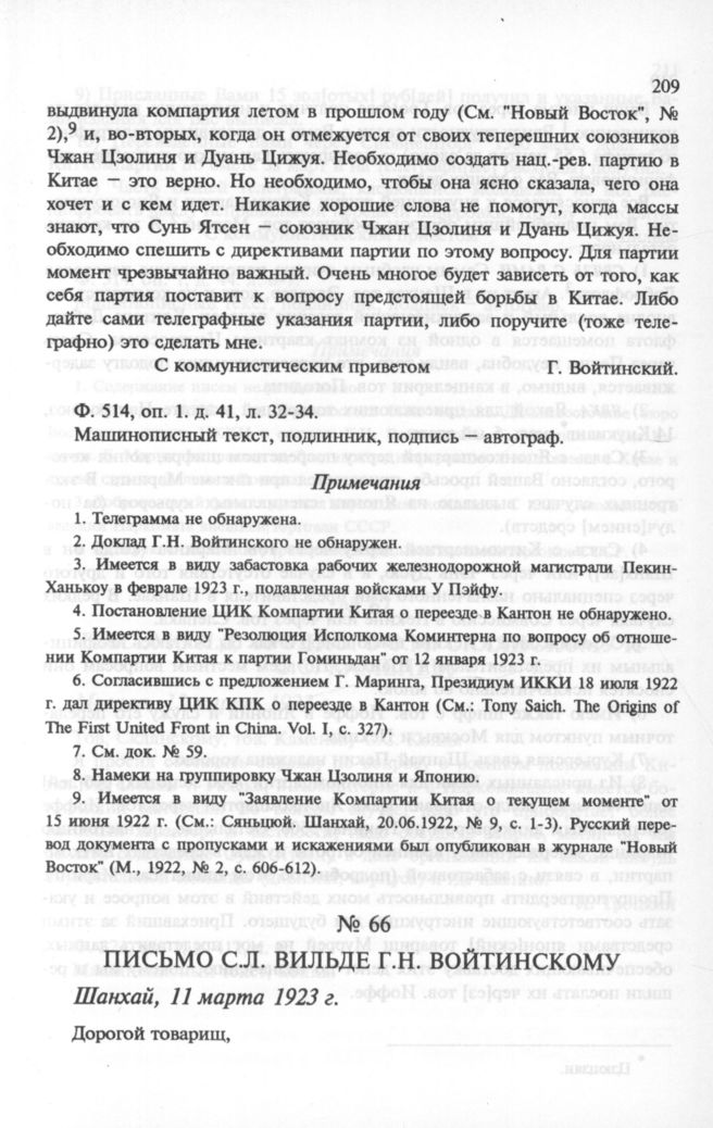Письмо С.Л. Вильде Г.Н. Войтинскому. Шанхай, 11 марта 1923 г. // РЦХИДНИ. Ф. 514, oп. 1, д. 44. л. 6-7. Машинописный текст, подлинник, подпись - автограф.