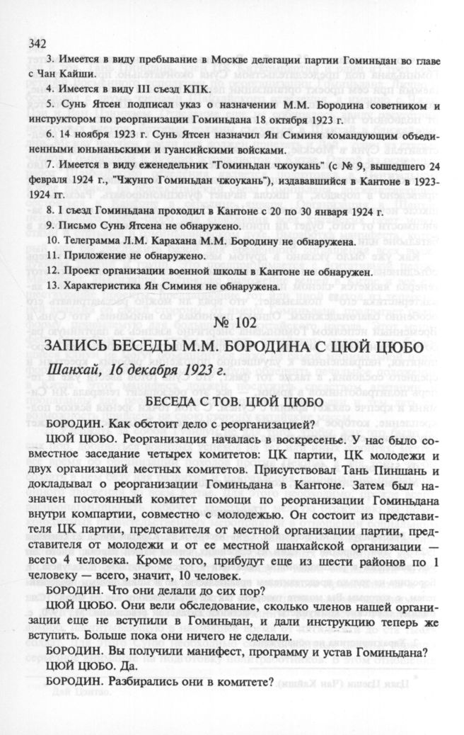 Запись беседы М.М. Бородина с Цюй Цюбо. Шанхай, 16 декабря 1923 г. // РЦХИДНИ. Ф. 514, oп. 1, д. 144, л. 136-144. Машинописный текст, копия, без подписи.