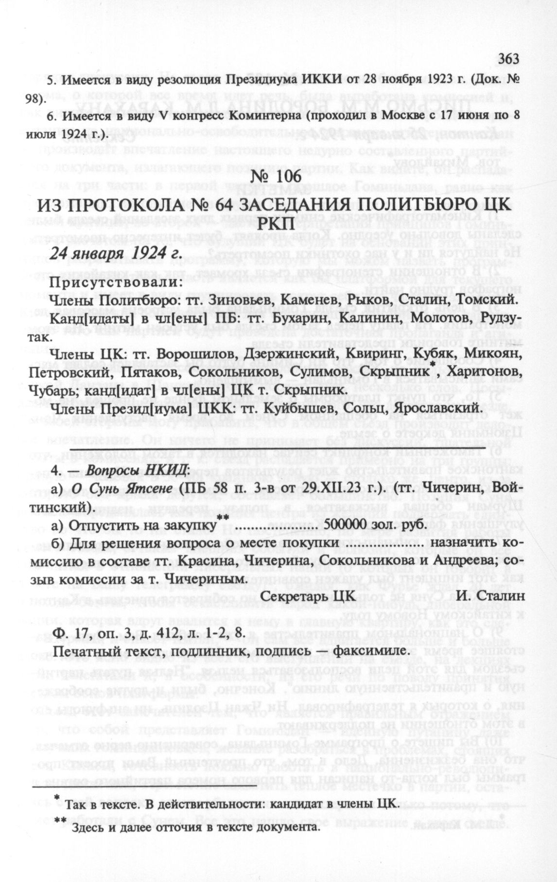 Из протокола № 64 заседания Политбюро ЦК РКП. 24 января 1924 г. // РЦХИДНИ. Ф. 17, оп. 3, д. 412, л. 1-2, 8. Печатный текст, подлинник, подпись - факсимиле.
