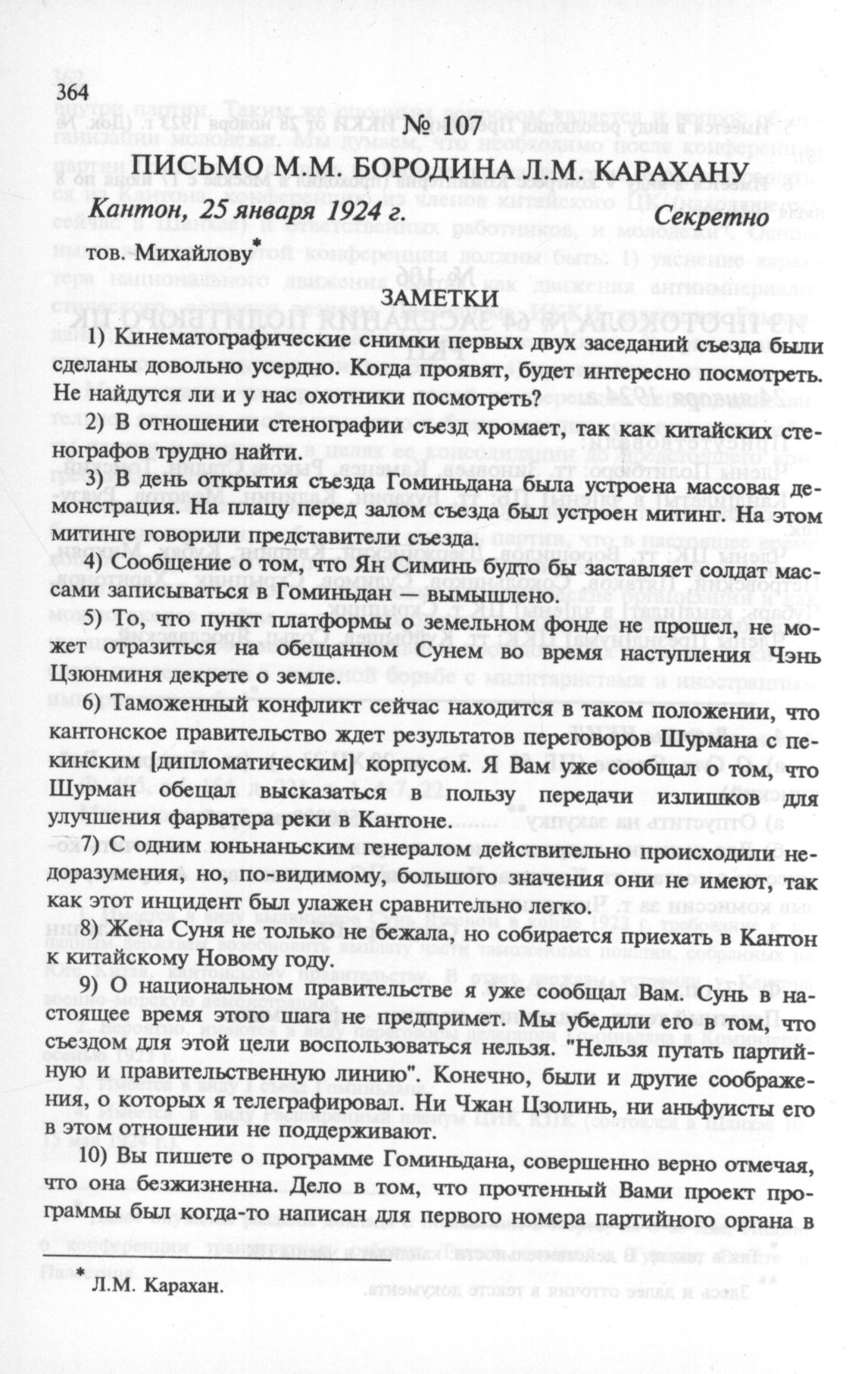 Письмо М.М. Бородина Л.М. Карахану. Кантон, 25 января 1924 г.