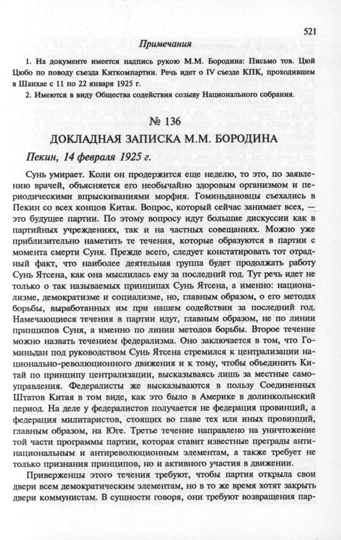 Докладная записка М.М.Бородина. Пекин, 14 февраля 1925 г. // РЦХИДНИ. Ф. 514, oп. 1, д. 144, л. 64-69. Машинописный текст, подлинник, подпись - автограф.
