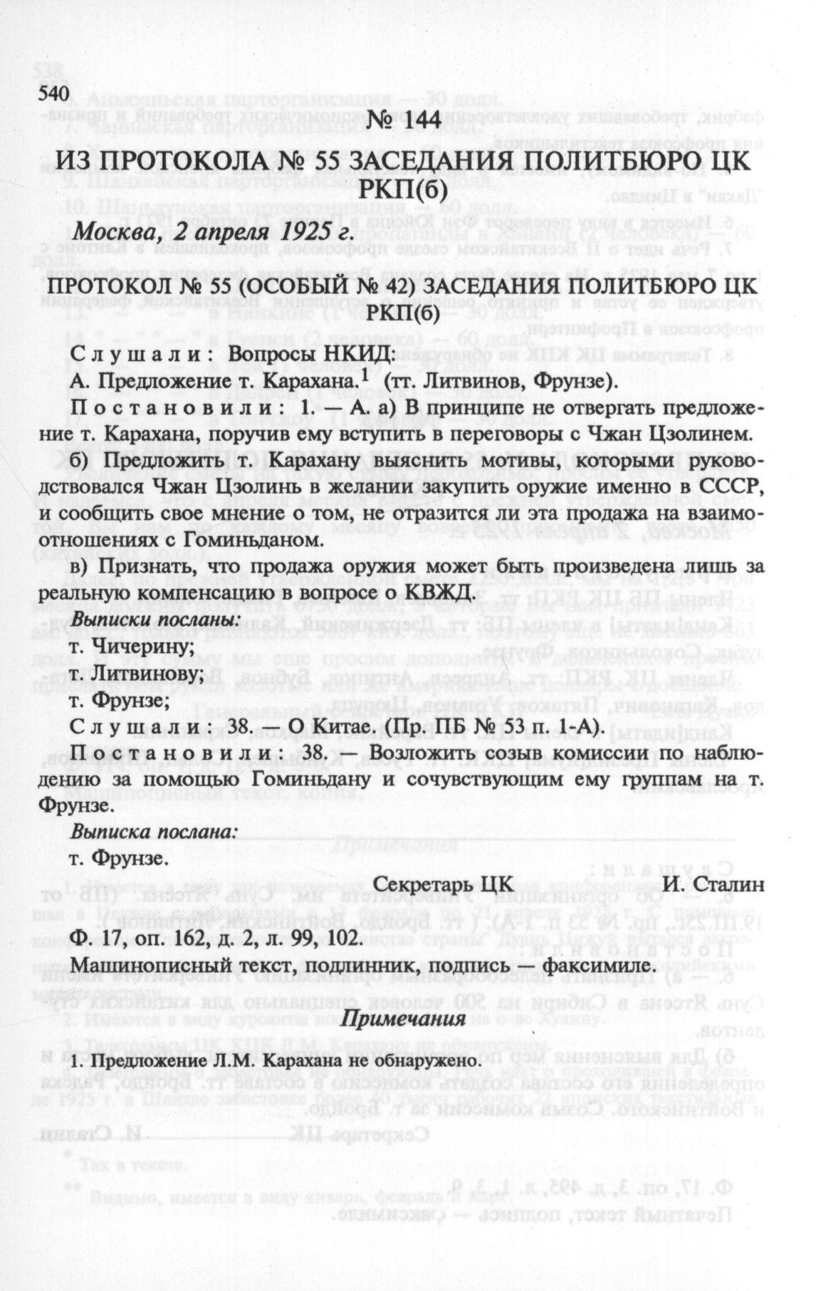 Из протокола № 55 заседания Политбюро ЦК РКП(б). Москва, 2 апреля 1925 г. // РЦХИДНИ. Ф. 17, оп. 162, д. 2, л. 99, 102. Машинописный текст, подлинник, подпись - факсимиле.