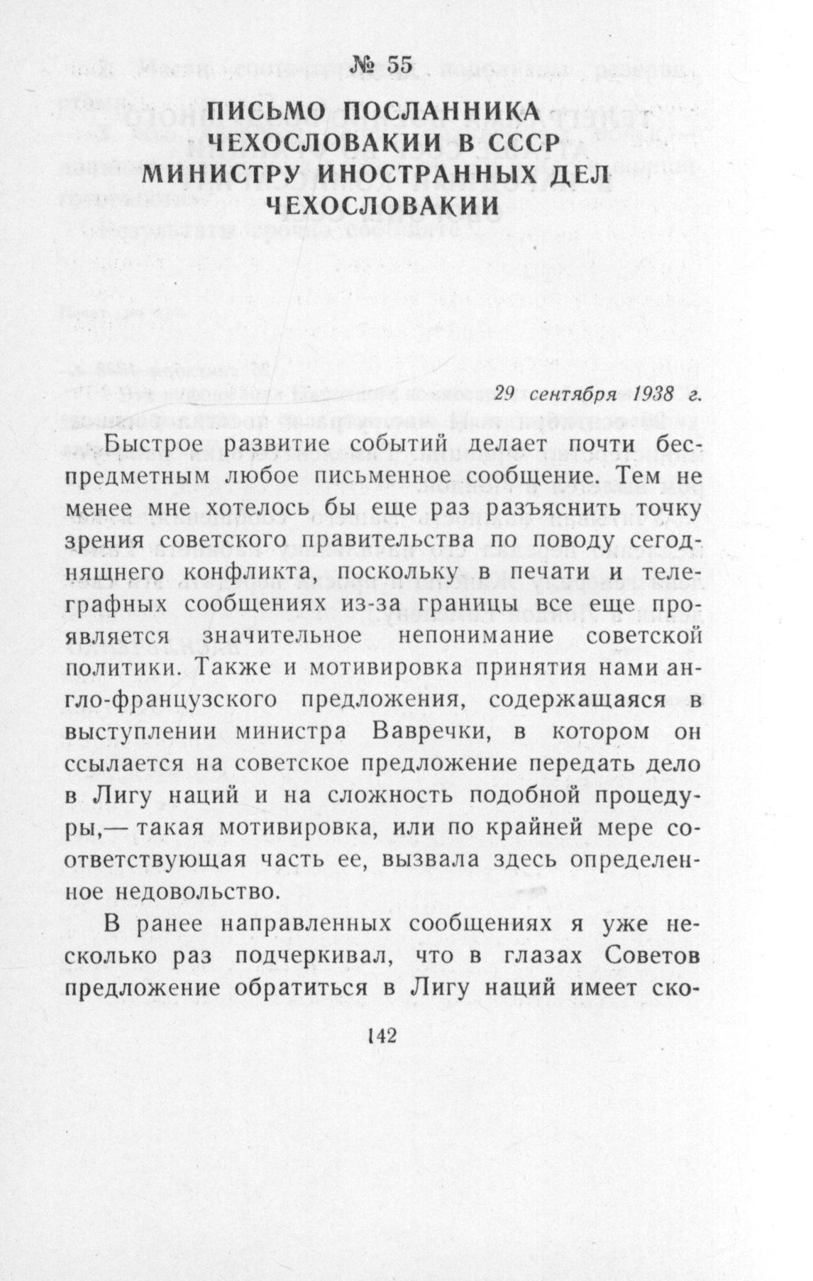 Письмо посланника Чехословакии в СССР министру иностранных дел Чехословакии. 29 сентября 1938 г. // Печат. по арх.