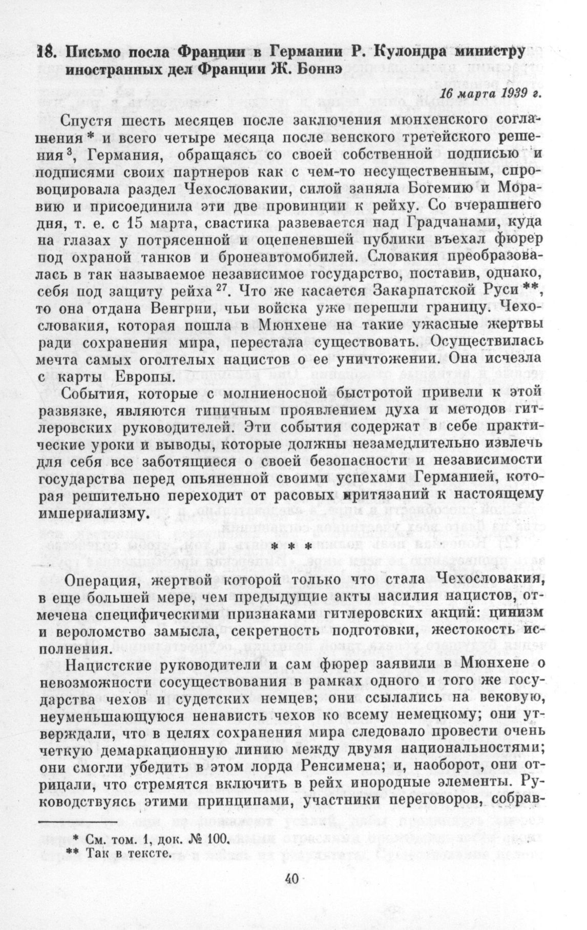 Письмо посла Франции в Германии Р. Кулондра министру иностранных дел Франции Ж. Боннэ. 16 марта 1939 г. // Печат. по изд.: «Documents diplomatiques français. 1938—1939». Ministère des affaires etrangères. Paris, 1939, p. 92—98.