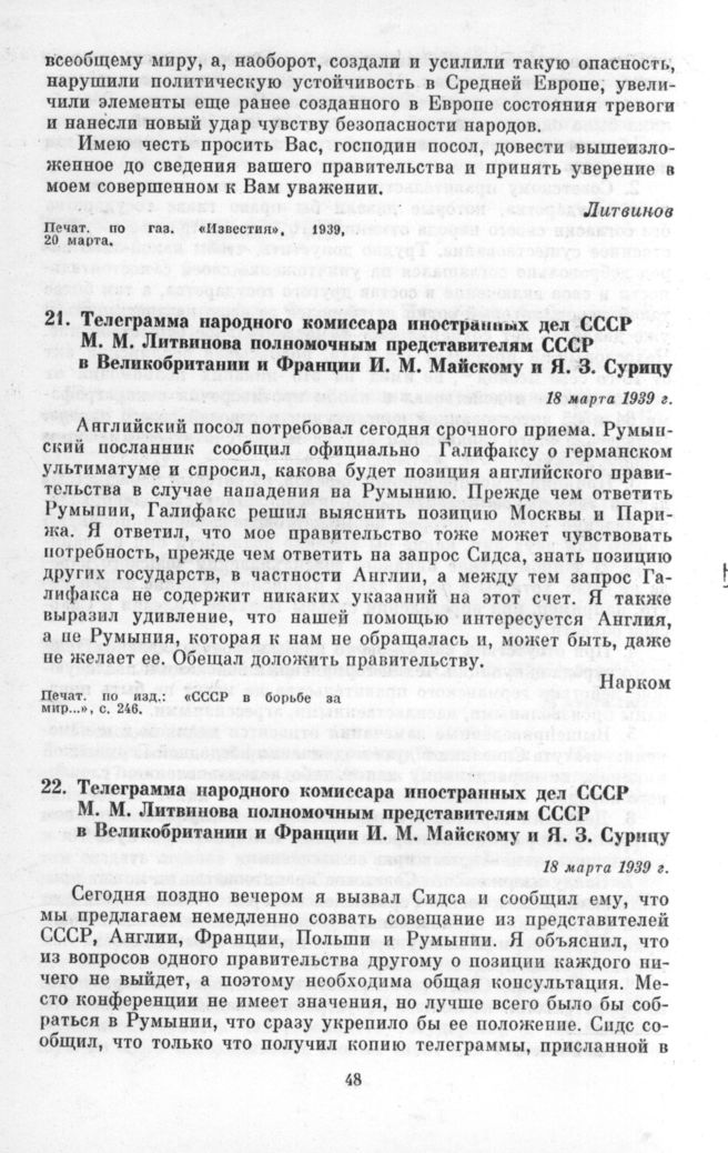 Телеграмма народного комиссара иностранных дел СССР М. М. Литвинова полномочным представителям СССР в Великобритании и Франции И. М. Майскому и Я. З. Сурицу. 18 марта 1939 г. // Печат. по изд.: «СССР в борьбе за мир...», с. 246.