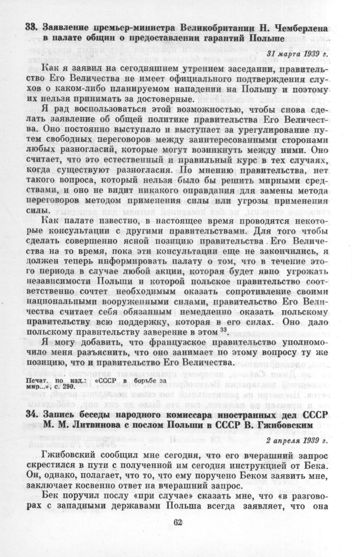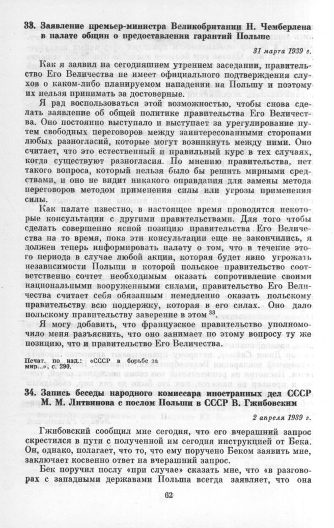 Заявление премьер-министра Великобритании Н. Чемберлена в палате общин о предоставлении гарантий Польше. 31 марта 1939 г. // Печат. по изд.: «СССР в борьбе за мир...», с. 290.