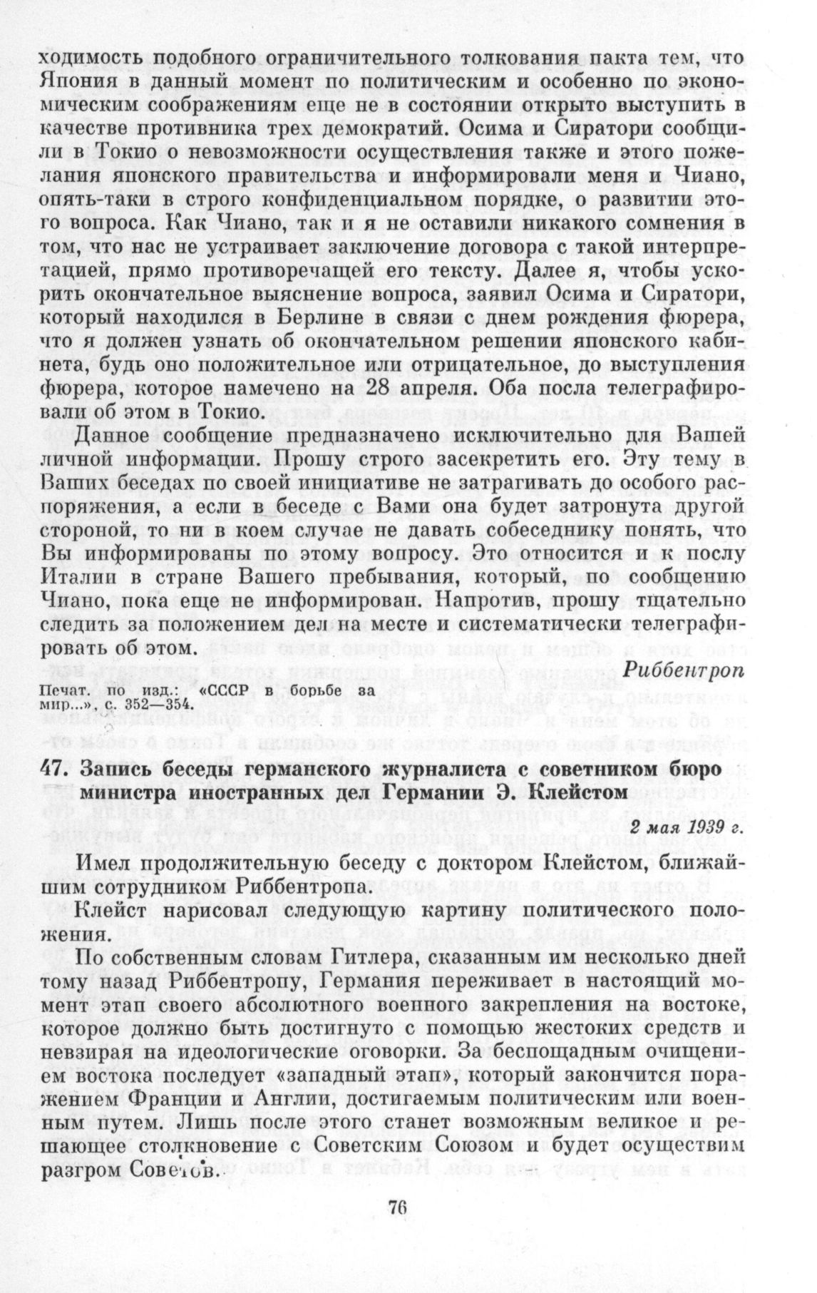 Запись беседы германского журналиста с советником бюро министра иностранных дел Германии Э. Клейстом. 2 мая 1939 г. // Печат. по изд.: «СССР в борьбе за мир...», с. 362—365.