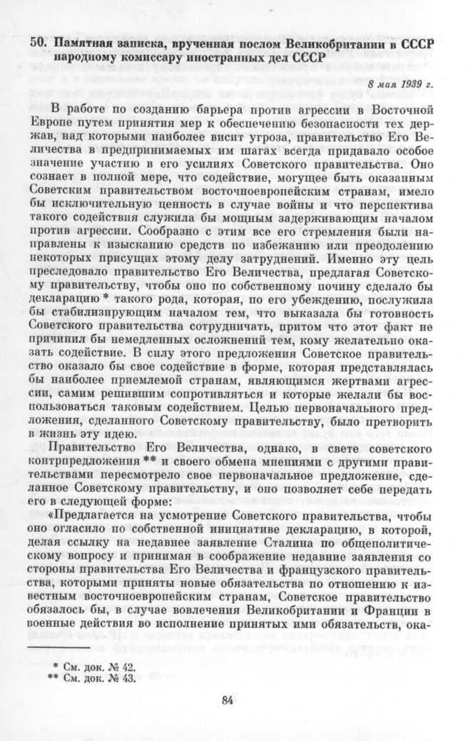 Памятная записка, врученная послом Великобритании в СССР народному комиссару иностранных дел СССР. 8 мая 1939 г. // Печат. по изд.: «СССР в борьбе за мир...», с. 382—383.