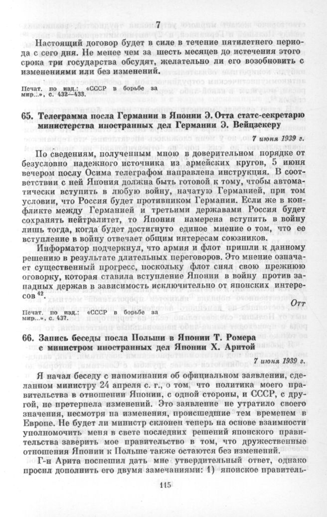 Запись беседы посла Польши в Японии Т. Ромера с министром иностранных дел Японии X. Аритой. 7 июня 1939 г. // Печат. по изд.: «СССР в борьбе за мир...», с. 437—441.
