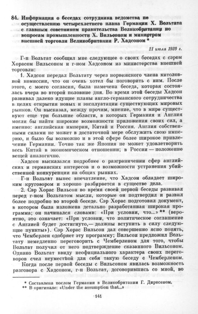 Информация о беседах сотрудника ведомства по осуществлению четырехлетнего плана Германии X. Вольтата с главным советником правительства Великобритании по вопросам промышленности X. Вильсоном и министром внешней торговли Великобритании Р. Хадсоном. 21 июля 1939 г. // Печат. по изд.: «Документы и материалы кануна второй мировой войны», т. II, с. 70—77.