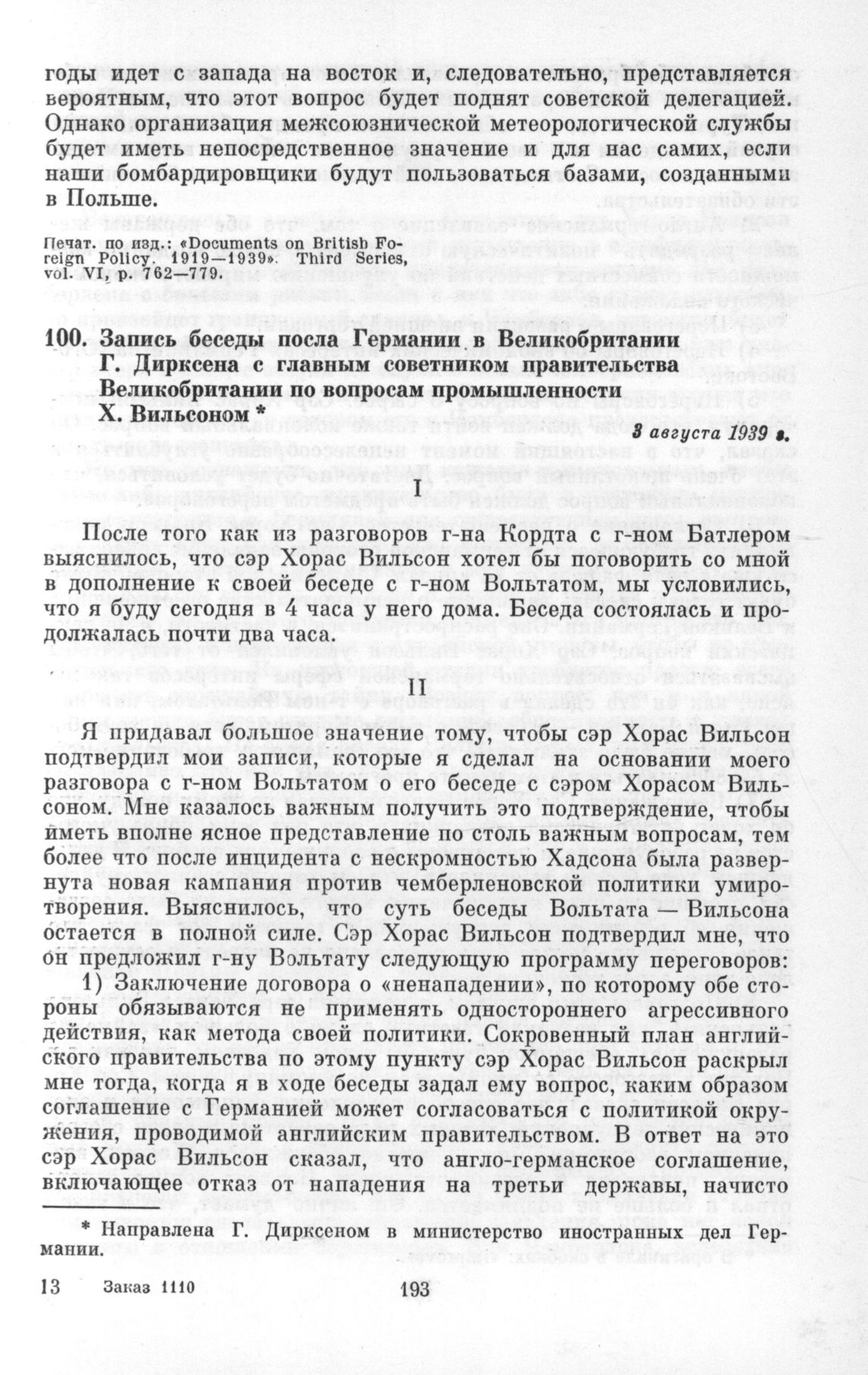 Запись беседы посла Германии в Великобритании Г. Дирксена с главным советником правительства Великобритании по вопросам промышленности X. Вильсоном. 3 августа 1939 г. // Печат. по изд.: «Документы и материалы кануна второй мировой войны», т. II, с. 131—142.